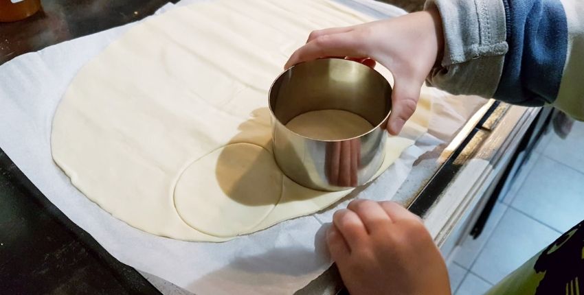 - Déroulez les deux pâtes feuilletées et découpez des ronds de 8cm de diamètre avec un emporte-pièce ou un verre. Déposez-les sur une feuille de papier cuisson.